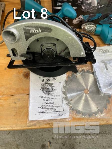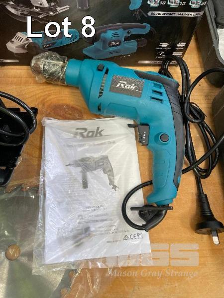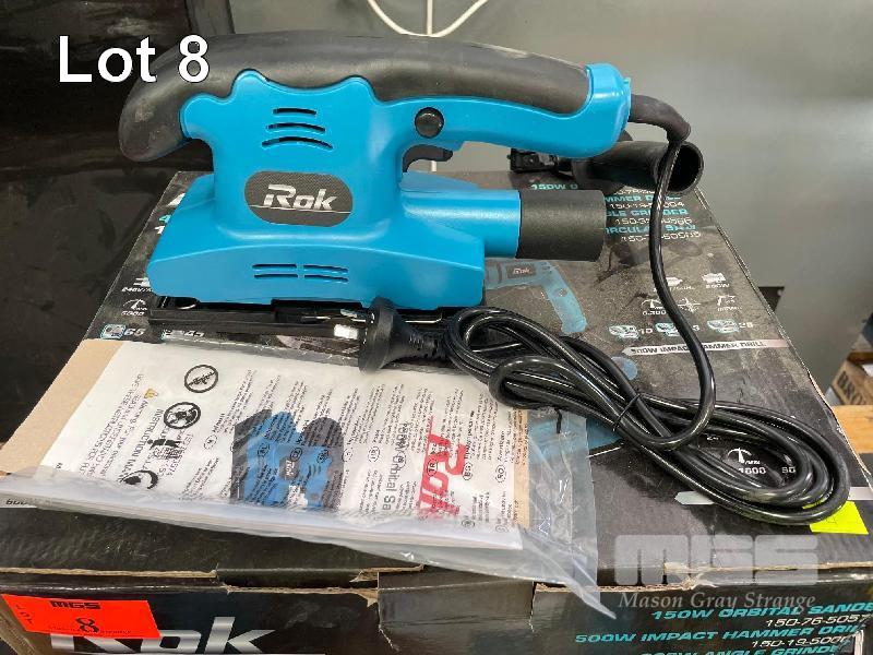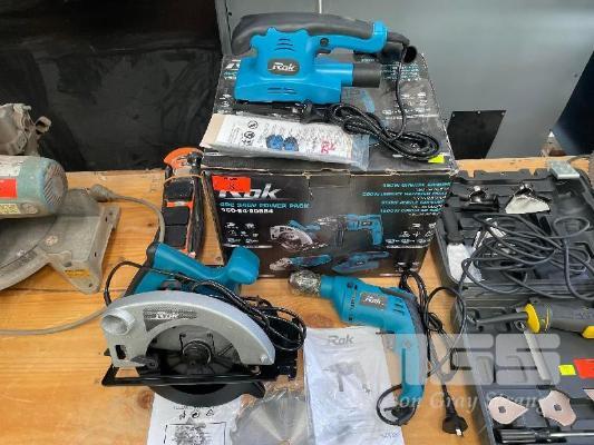 ROK POWER TOOLS INCLUDING, CIRCULAR SAW, 185mm, IMPACT DRILL, 13mm, ORBITAL SANDER, 150w, AS NEW WITH BOOKLETS & OUTDOOR POWER BOARD