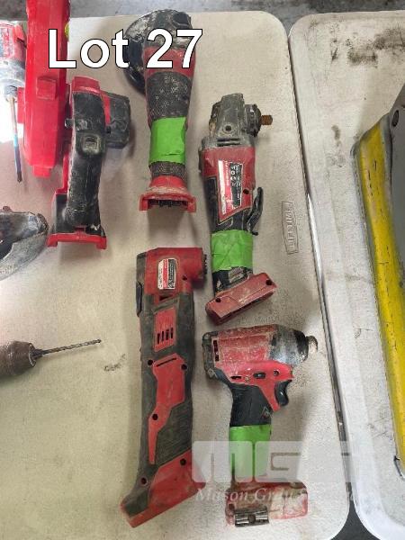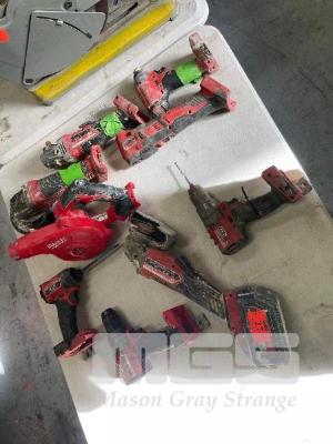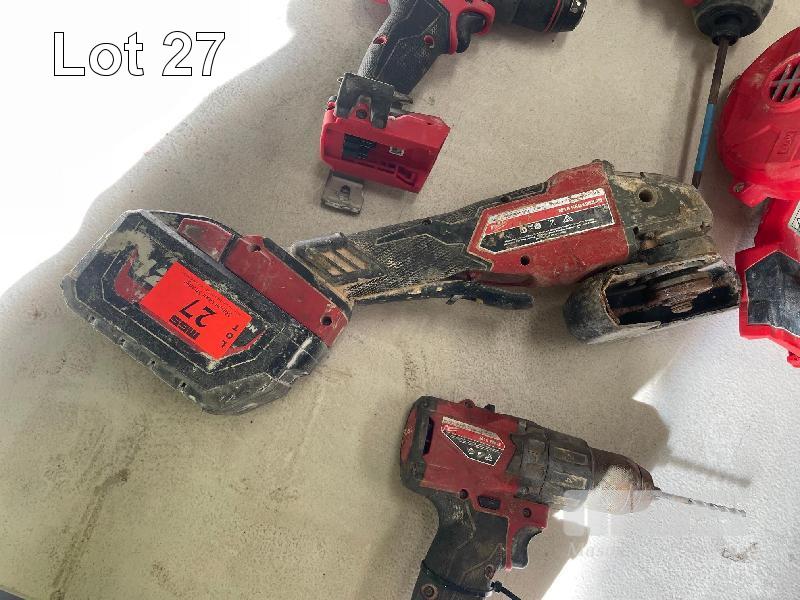 MILWAUKEE POWER TOOLS, 18V INCLUDING, ANGLE GRINDER, MOD: M18FAG125XPD WITH 12.0AH BATTERY, 2 x DRILLS, MOD: M18FPD2 & M18FPD3 BLOWER MOD: M18BBL & 3 x ANGLE GRINDERS & TEK GUN ALL FAULTS MARKED GREEN NO CHARGER