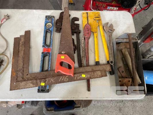 ASSORTED HAND TOOLS, SET SQUARES, PIPE WRENCHES, CHAIN WRENCH, SPIRIT LEVEL, SHIFTER ETC.