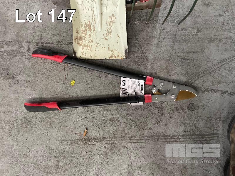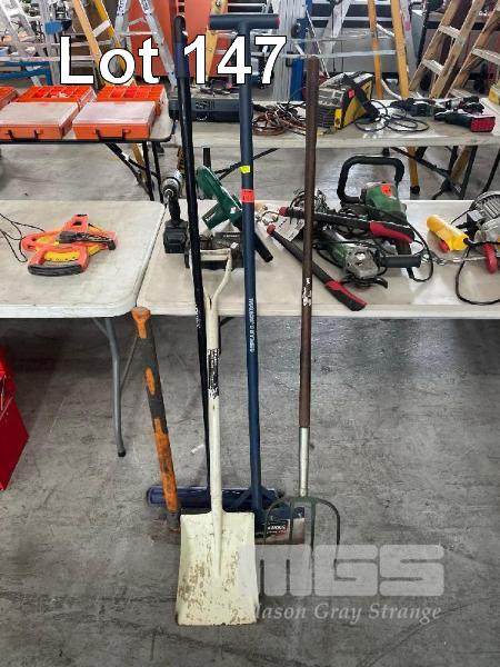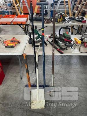 LANDSCAPING TOOLS INCLUDING, CHOVEL, SCAPER, HAY FORK, BROOM, SLEDGEHAMMER & TROJAN LOPPERS