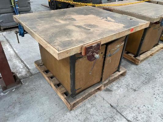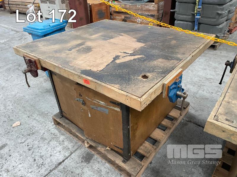 TIMBER WORK BENCH, 1250 x 1400 x 830mm (H), WITH DAWN VICE, 175mm & CLAMP VICE, 175mm, WITH UNDER BENCH STORAGE