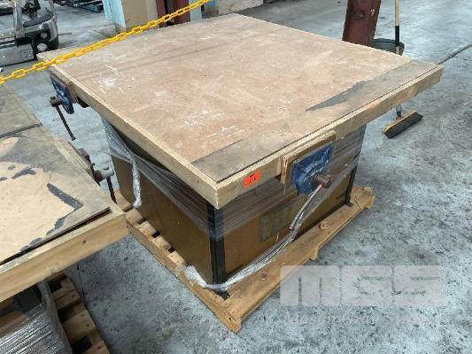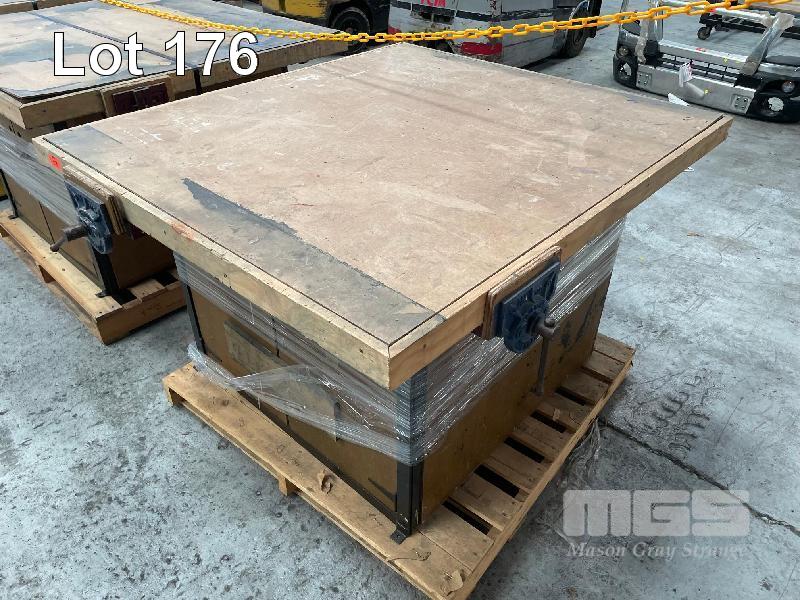 TIMBER WORK BENCH, 1250 x 1400 x 830mm (H), WITH 3 x DAWN VICES, 175mm WITH UNDER BENCH STORAGE