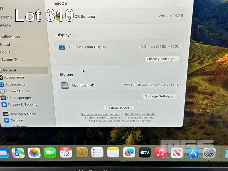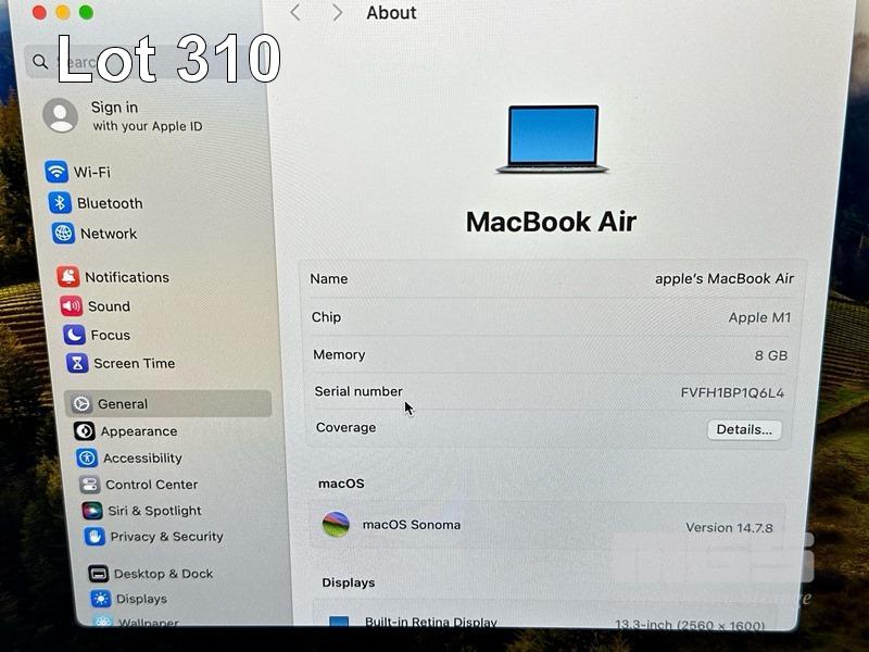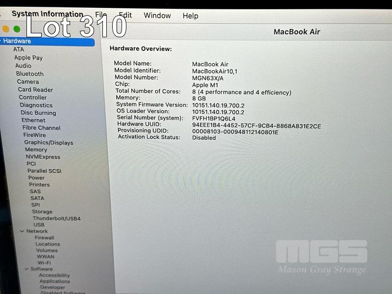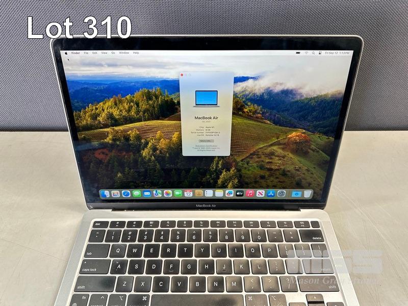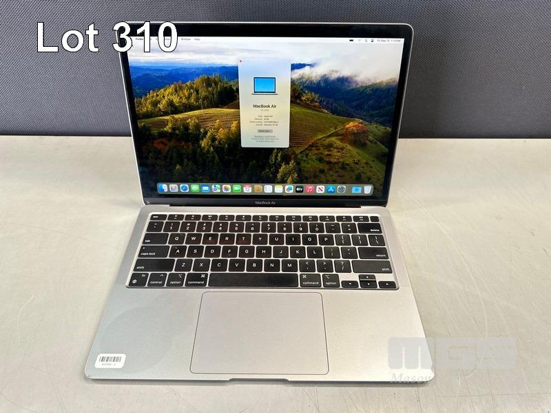 LAPTOP, APPLE MACBOOK AIR (A2337), MGN63X/A, APPLE M1 8 CPU, 7 GPU, 8GB RAM, 256GB SSD, 13.3" RETINA DISPLAY (2560x1600), Wi-Fi, BLUETOOTH, MAC OS 14 INSTALLED (NO USB-C POWER SUPPLY) (NOTE: MINOR DAMAGE TO CASING & SCREEN FRAME, MINOR MARKS ON SCREEN) S/N:FVFH1BP1Q6L4