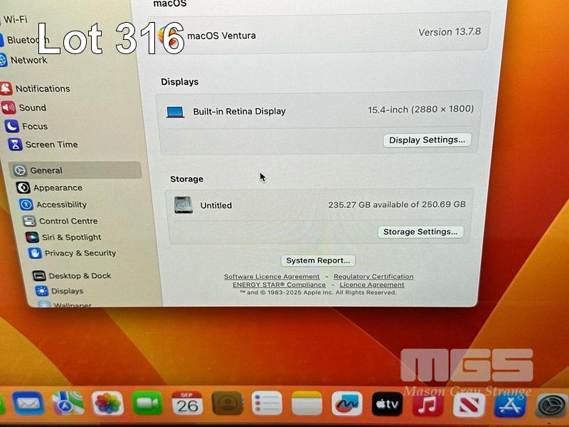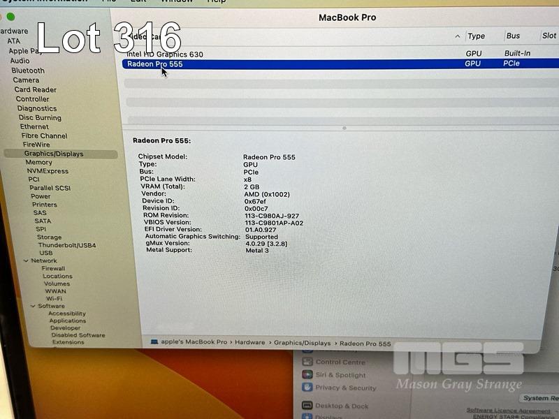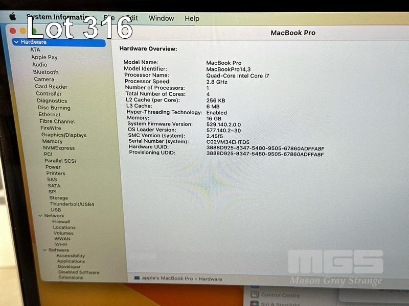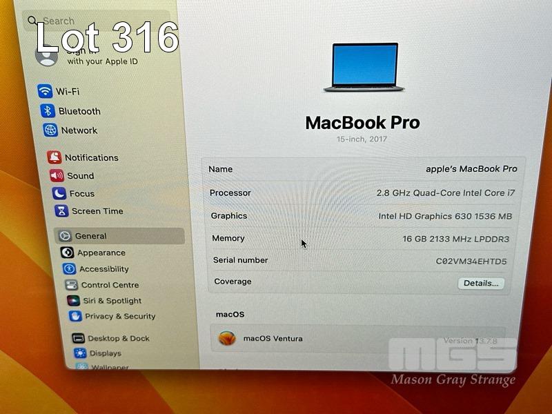 LAPTOP, APPLE MACBOOK PRO (A1707), CORE i7 7700HQ (7TH GEN) @ 2.8GHz, 16GB DDR3 RAM, 256GB SSD, 15.4" RETINA DISPLAY (2880x1800), INTEL HD GRAPHICS 630, 2GB RADEON PRO 555 VIDEO, Wi-Fi, BLUETOOTH, MAC OS 13 INSTALLED & USB-C POWER SUPPLY (NOTE: MINOR MARKS ON SCREEN) S/N:C02VM34EHTD5