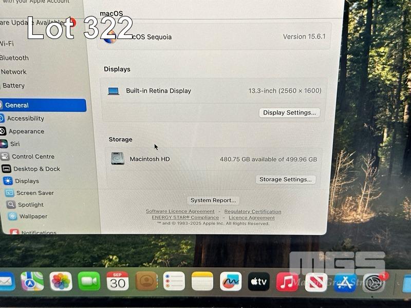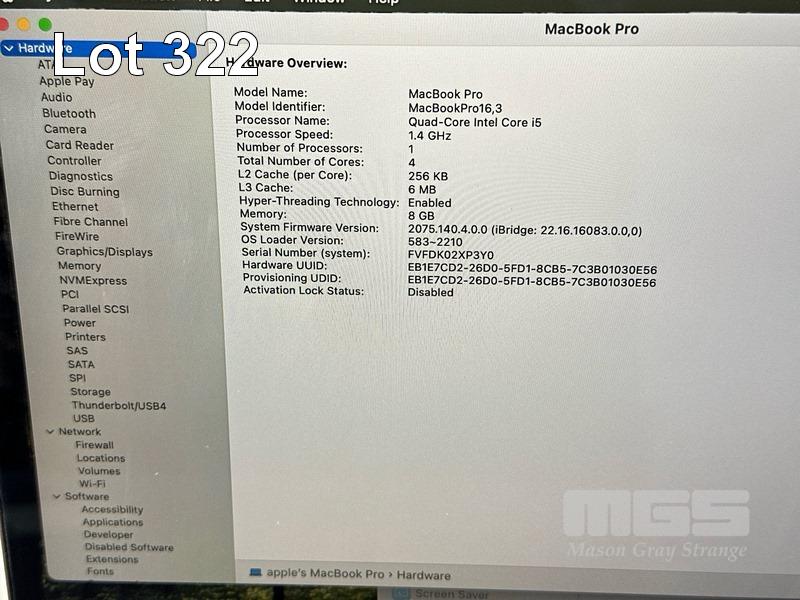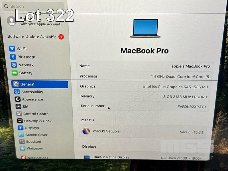 LAPTOP, APPLE MACBOOK PRO (A2289), CORE i5 8257U (8TH GEN) @ 1.4GHz, 8GB DDR3 RAM, 512GB SSD, 13.3" RETINA DISPLAY (2560x1600), INTEL IRIS PLUS GRAPHICS 645, Wi-Fi, BLUETOOTH, MAC OS 15 INSTALLED (NO USB-C POWER SUPPLY) (NOTE: FAULTY SCREEN - FLICKERING, LINES) S/N:FVFDK02XP3Y0