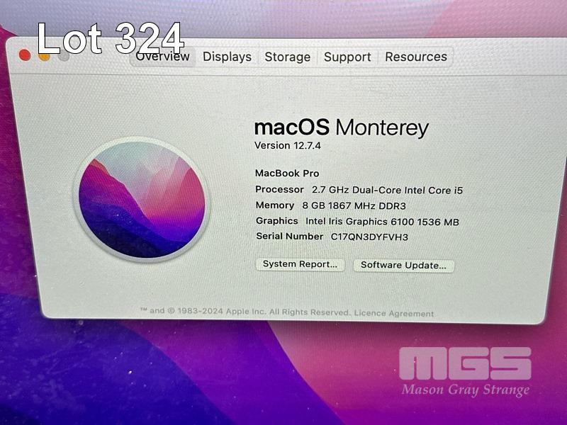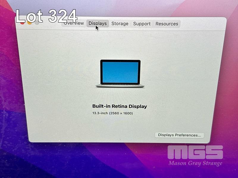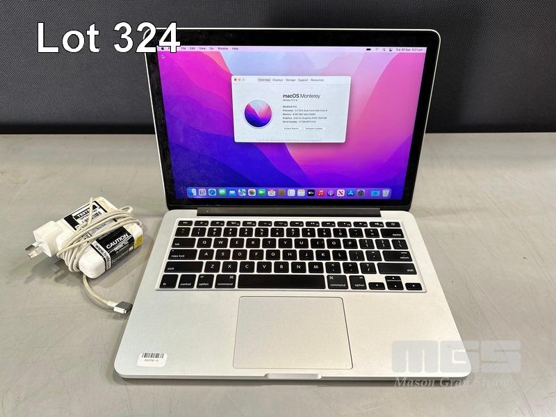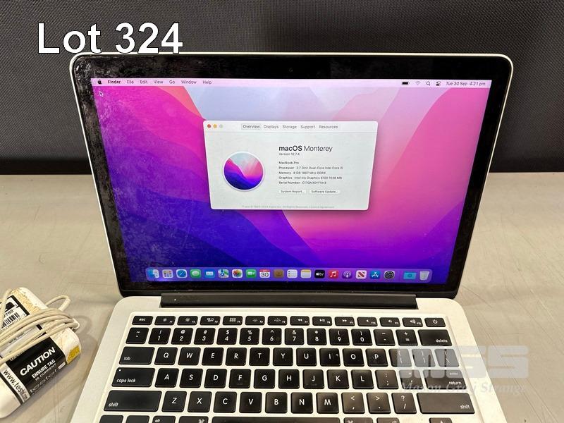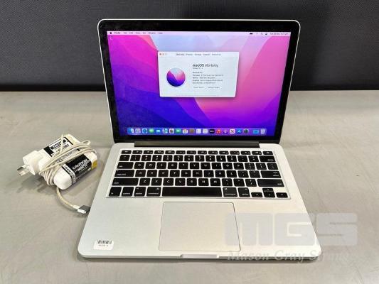 LAPTOP, APPLE MACBOOK PRO (A1502), CORE i5 5257U (5TH GEN) @ 2.7GHz, 8GB DDR3 RAM, 128GB SSD, 13.3" RETINA DISPLAY (2560x1600), INTEL IRIS GRAPHICS 6100, Wi-Fi, BLUETOOTH, MAC OS 12 INSTALLED & POWER SUPPLY (NOTE: MAJOR MARKS ON SCREEN, SPOT ON SCREEN) S/N:C17QN3DYFVH3