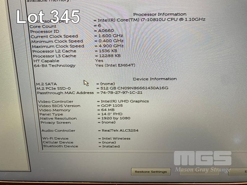 LAPTOP, DELL LATITUDE 7410, CORE i7 10810U (10TH GEN) @ 1.1GHz, 16GB DDR4 RAM, 512GB NVMe M.2 SSD, 14" WIDESCREEN (1920x1080), INTEL UHD GRAPHICS, Wi-Fi, BLUETOOTH, WINDOWS 11 HOME INSTALLED (NO USB-C POWER SUPPLY) (NOTE: BATTERY NOT HOLDING CHARGE, RUBBER PAD MISSING ON BOTTOM OF LAPTOP, SPOT ON SCREEN) S/N:86S3S73