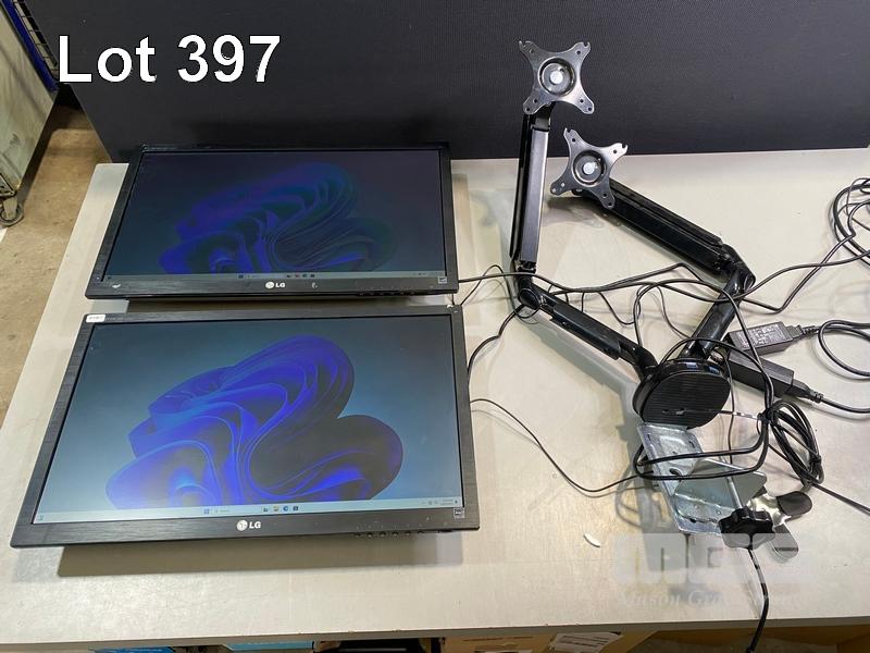 2 x MONITORS, LG FLATRON E2351 23" LCD WIDESCREEN, HDMI, VGA, DVI (WITH CABLES) WITH DUAL DESK MOUNT MONITOR ARM, BLACK