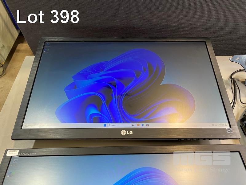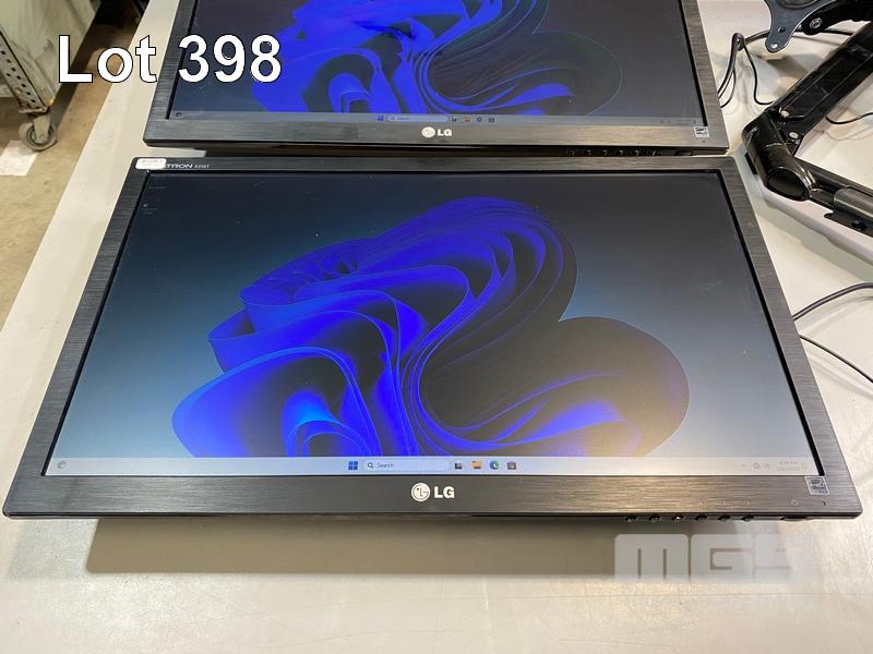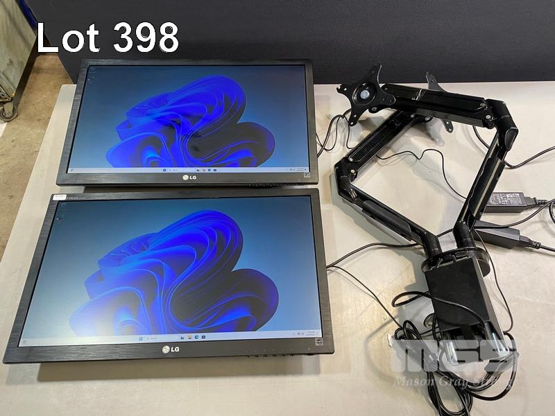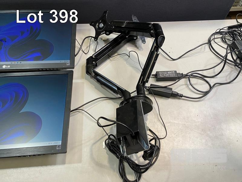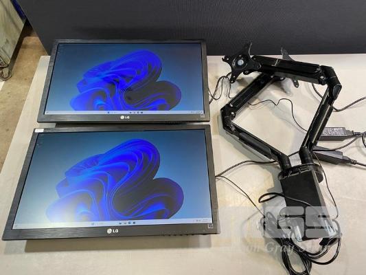 2 x MONITORS, LG FLATRON E2351 23" LCD WIDESCREEN, HDMI, VGA, DVI (WITH CABLES) WITH DUAL DESK MOUNT MONITOR ARM, BLACK