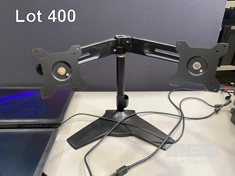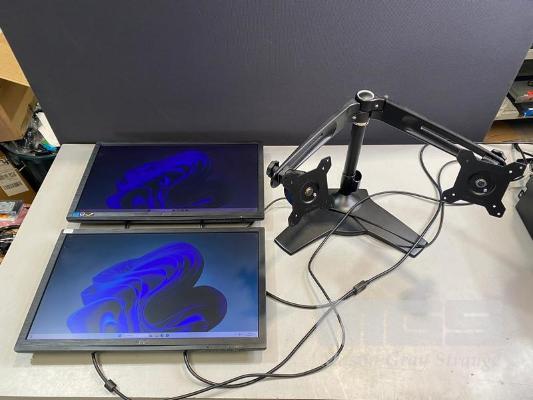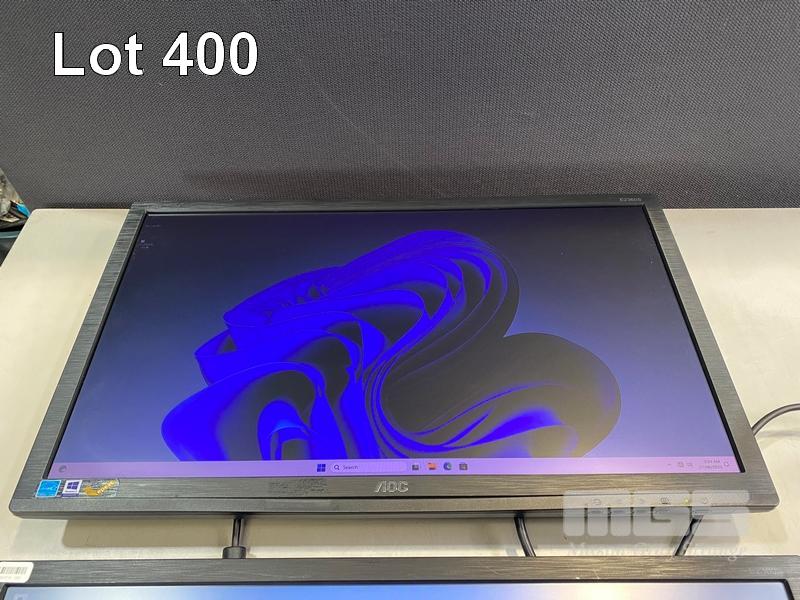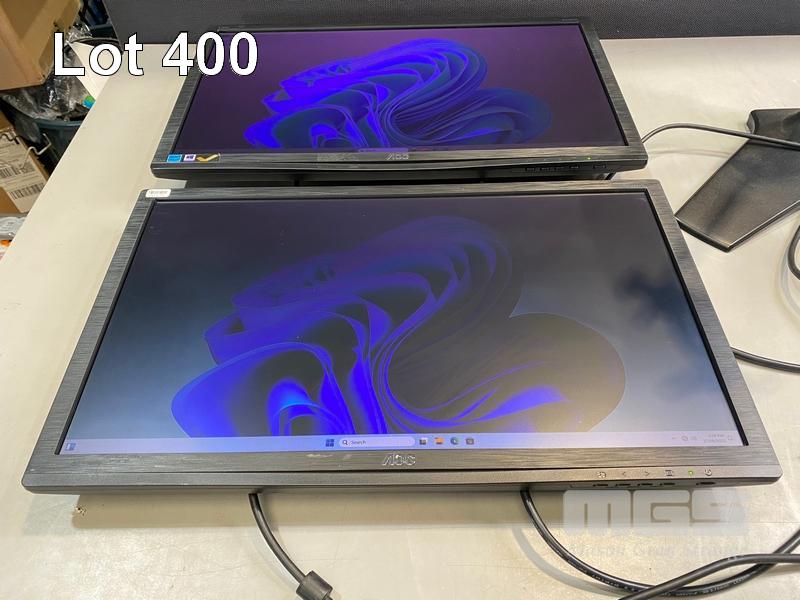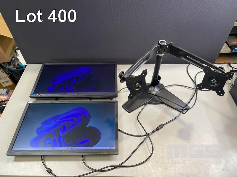 2 x MONITORS, AOC e2360Sd 23" LED WIDESCREEN, VGA, DVI (WITH CABLES) WITH FREESTANDING DUAL MONITOR STAND