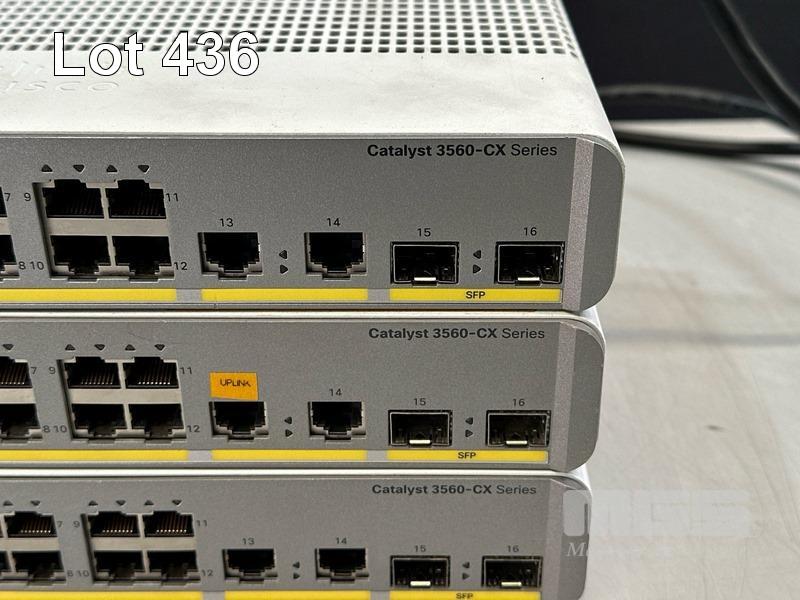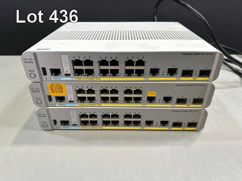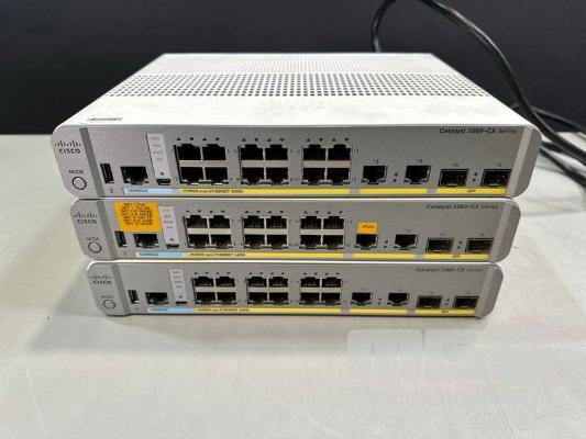 3 x CISCO CATALYST 3560-CX SERIES SWITCHES, WS-C3560CX-12PC-S V02 WITH IEC-C14 TO C15 NOTCH POWER CABLES S/N:FOC2003Z47B, FOC2004W1QN, FOC2004W1ZF