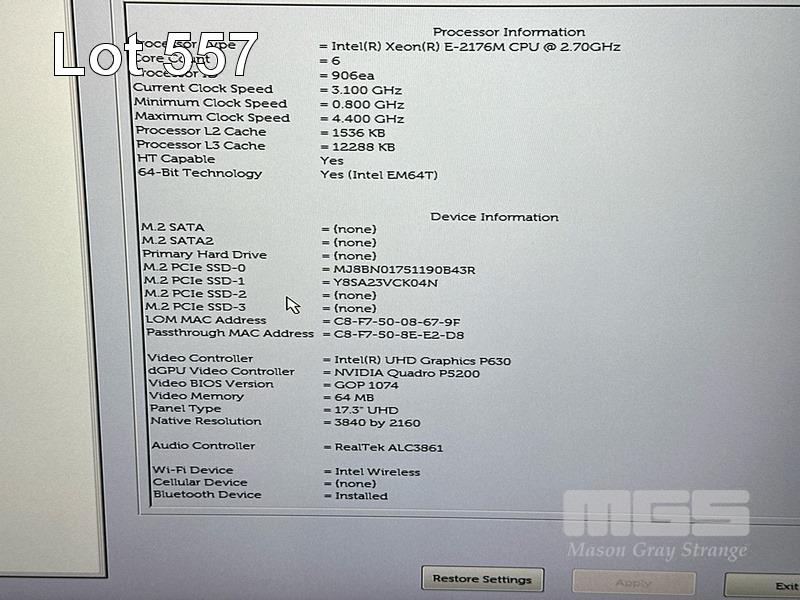 LAPTOP, DELL PRECISION 7730, XEON E-2176M @ 2.7GHz, 64GB DDR4 RAM, 1TB NVMe M.2 SSD, 512GB NVMe M.2 SSD, 17.3" WIDESCREEN (3840x2160), 16GB NVIDIA QUADRO P5200 VIDEO, Wi-Fi, BLUETOOTH, WINDOWS 11 PRO INSTALLED & POWER SUPPLY (NOTE: DUSTY PORTS, MINOR CASING DAMAGE) S/N:FLZ38S2