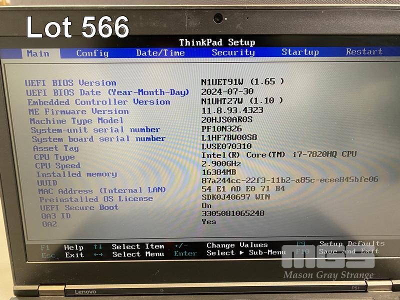 LAPTOP, LENOVO THINKPAD P51 MOBILE WORKSTATION, TYPE 20HJ, CORE i7 7820HQ (7TH GEN) @ 2.9GHz, 16GB DDR4 RAM, 512GB NVMe M.2 SSD, 15.6" WIDESCREEN (1920x1080), 4GB NVIDIA QUADRO M2200 VIDEO, Wi-Fi, BLUETOOTH, WINDOWS 10 PRO INSTALLED (NO POWER SUPPLY) (NOTE: CRACK LINE ON CASING, MARKS ON SCREEN) S/N:PF10N326