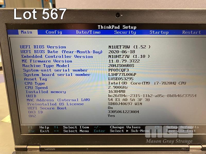 LAPTOP, LENOVO THINKPAD P51 MOBILE WORKSTATION, TYPE 20HJ, CORE i7 7820HQ (7TH GEN) @ 2.9GHz, 16GB DDR4 RAM, 512GB NVMe M.2 SSD, 15.6" WIDESCREEN (1920x1080), 4GB NVIDIA QUADRO M2200 VIDEO, Wi-Fi, BLUETOOTH, WINDOWS 10 PRO INSTALLED (NO POWER SUPPLY) (NOTE: CRACK LINE ON CASING) S/N:PF0TCQF3