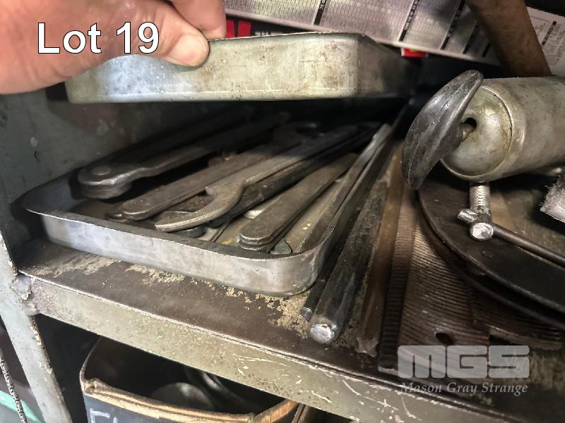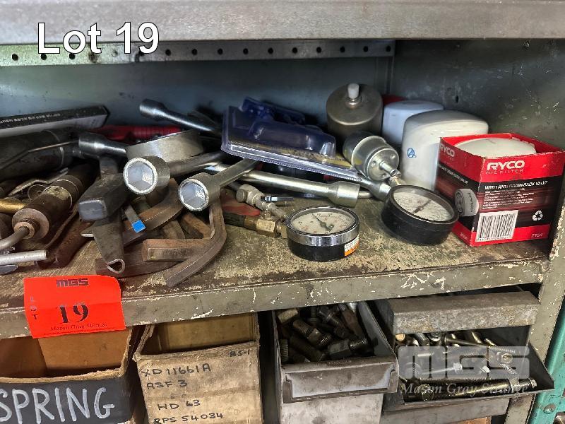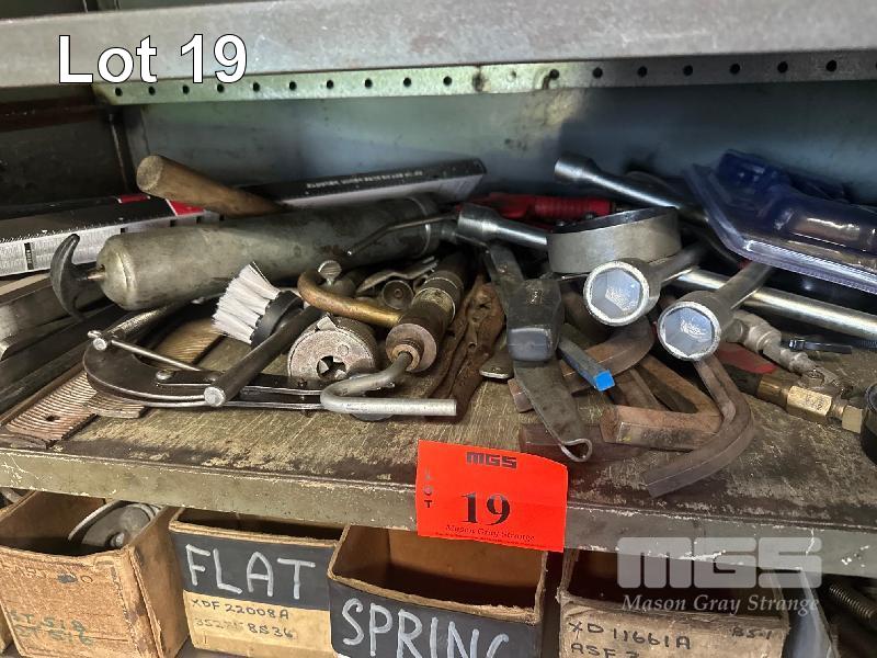 LARGE ALLEN KEYS, WHEEL BRACES, GAUGES, SPRING COMPRESSOR, C SPANNERS, RASPS, ETC 1 x SHELF