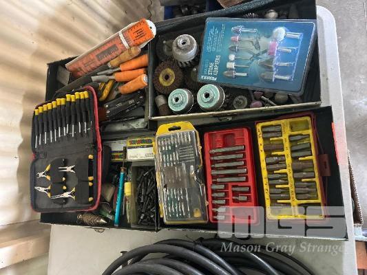 WIRE BRUSHES, TEK BITS, PIN PUNCH SET, CHISELS, STONES, 1 x TRAY