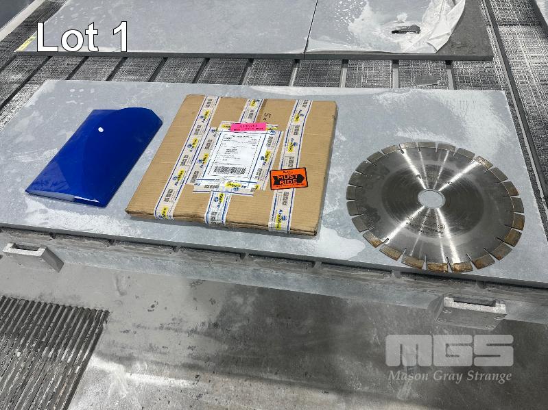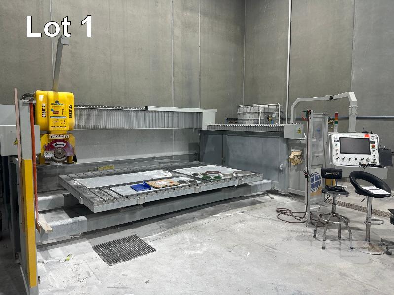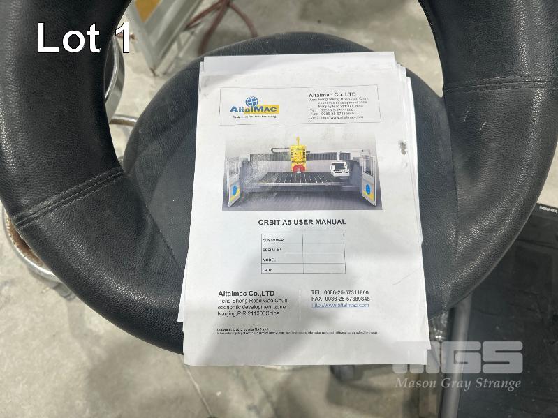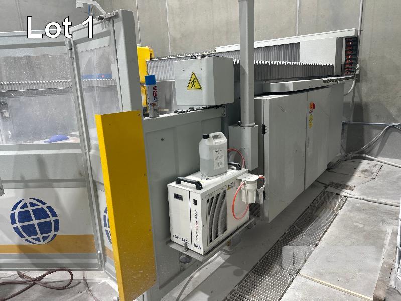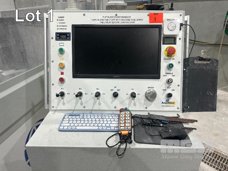 AITAL-MAC CNC BRIDGE SAW MOD: ORBIT-A5 DOM: 2023 5 AXIS, 415V HARD WIRED 3600 x 2400mm CUTTING TABLE CONSUL CNC CONTROLLER WITH REMOTE FRONT DOOR PANELS REMOVED ELECTRIC EYE GUARDING + CIRCULATING FLUID PUMP, 2 x IBCS EDGE GRINDING DISCS & SPARE BLADES