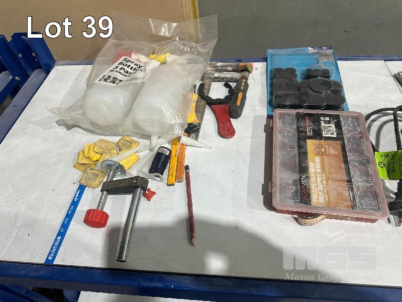 MULTI METER, AIR DISC GRINDER, BATTERY CHARGER, SET SQUARE, LEVELS, SPRAY BOTTLES, AIR MANIFOLD, ETC