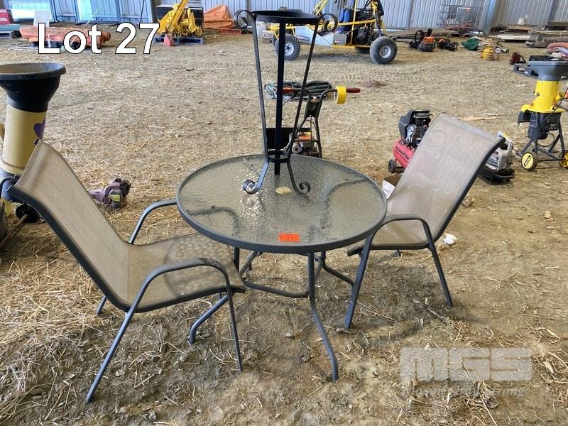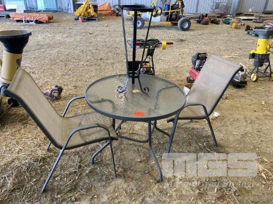CIRCULAR GLASS TOPPED OUTDOOR TABLE & 2 x CHAIRS