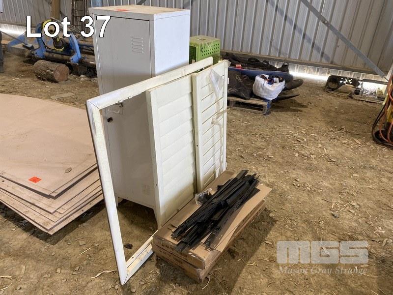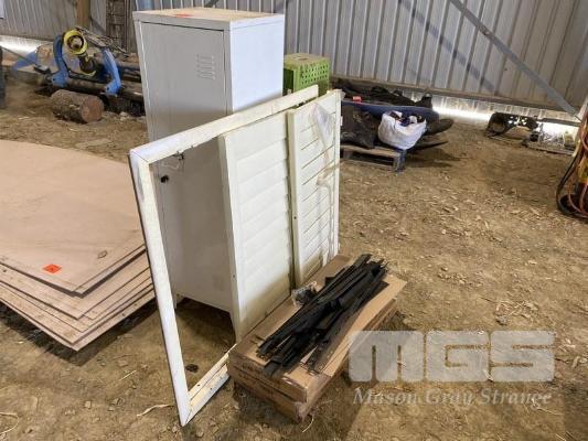 METAL CABINET, LOUVRE WINDOW SHADE & 3 x BOXES METAL SHELVING