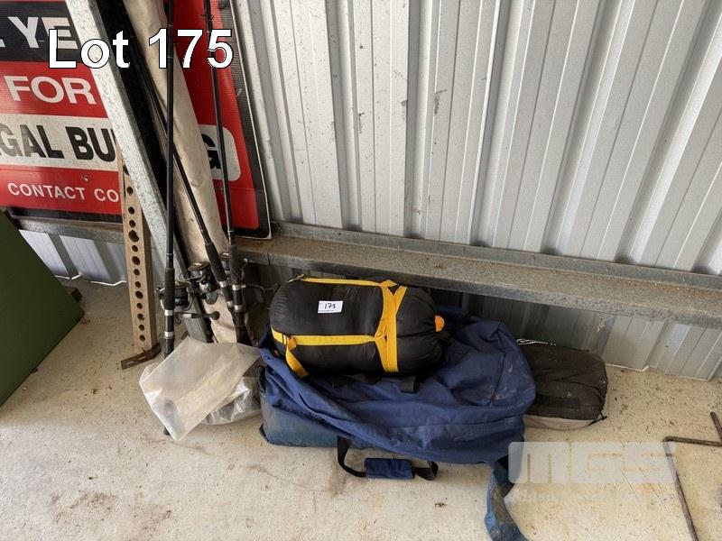 3 x FISHING RODS, SLEEPING BAG & TENT