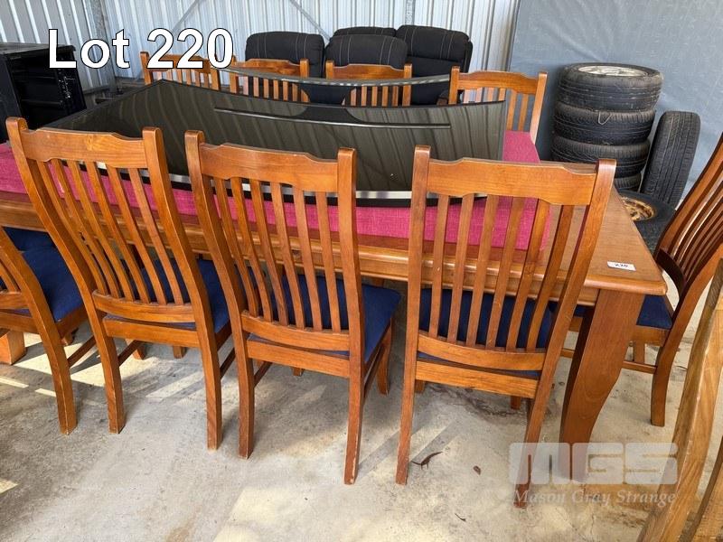 STAINED TIMBER DINING SUITE, TABLE & 10 x CHAIRS