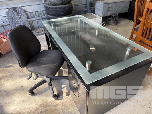 BLACK LAMINATE, GLASS TOPPED OFFICE DESK & CHAIR