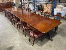 VICTORIAN MAHOGANY 4 SECTION TABLE, 5550 x 1250 x 730mm (H) WITH BRASS SECTION LOCKS (PHOTOGRAPHED) CLAW & BALL PEDESTAL SECTION BASES WITH BRASS SWIVEL WHEELS, VARIOUS MINOR DAMAGE REFLECTIVE OF AGE WITH SET OF 16 LATE VICTORIAN STYLE UPHOLSTERED DINING CHAIRS TURNED FRONT LEGS WITH BRASS & PORCELAIN CASTORS, LEATHER UPHOLSTERY (SOME REPAIRS HAVE BEEN UNDERTAKEN BUT IN OVERALL GOOD CONDITION