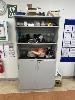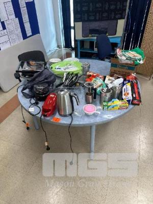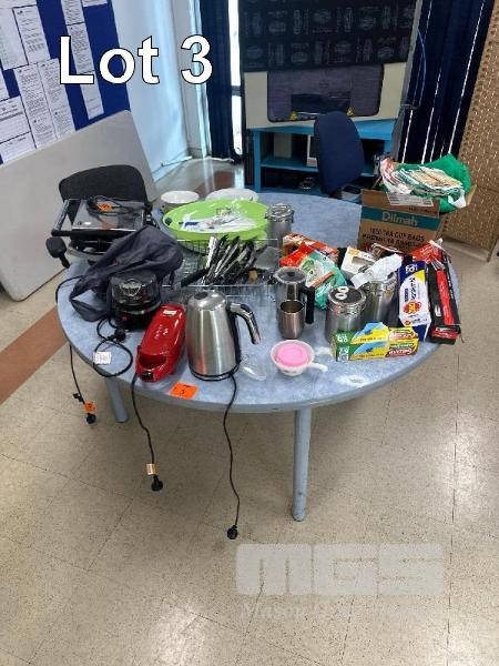 CIRCULAR LUNCH ROOM TABLE, 1500mm (D) WITH CONTENTS KITCHEN SUNDRIES + TIMBER LAMINATE CUPBOARD, 1800 x 900 x 400mm (NOT THE CONTENTS)