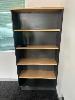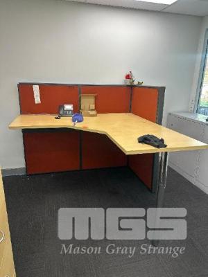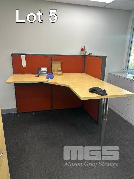 OFFICE SET, STAND UP CORNER DESK, TIMBER LAMINATE, 1800 x 1800 x 1020mm (H), WITH PARTITIONS, 2 x 4 DRAWER FILING CABINETS, 1320mm (H), MATCHING BOOK SHELF, 1800 x 900 x 300mm