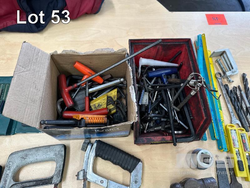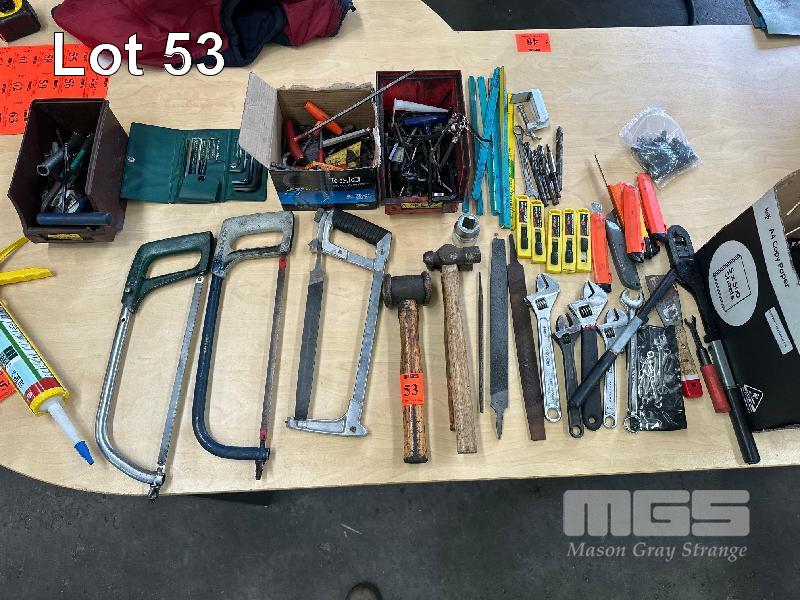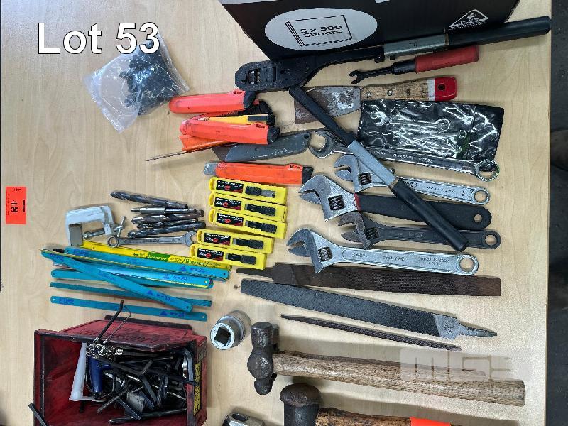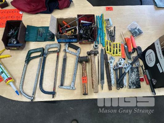 QTY HAND TOOLS, SAW, BLADES, HAMMERS, HEX KEYS, WRENCHES ETC.