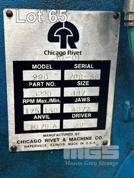 CHICAGO RIVER, PNEUMATIC RIVETER, MOD: 990, SERIAL: 708-SS, 415V + AF RIVETER SUIT SPARE PARTS