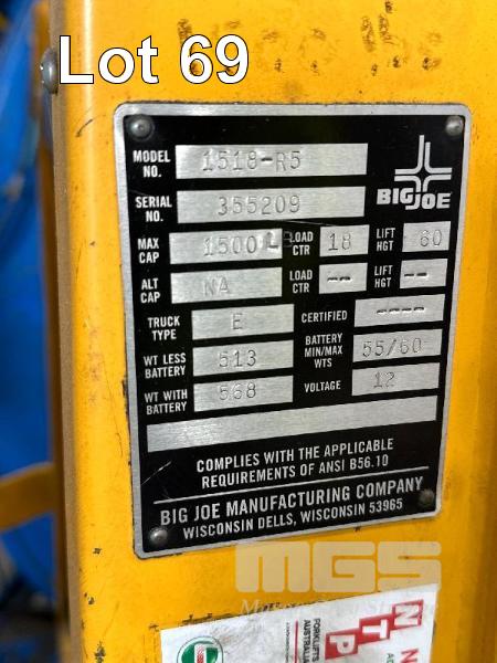 BIG JOE ELECTRIC DIE TROLLEY MOD: 1518-RS, MAX: 1500LB, 240V 10AMP CHARGER