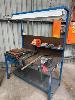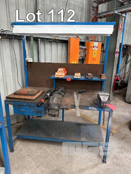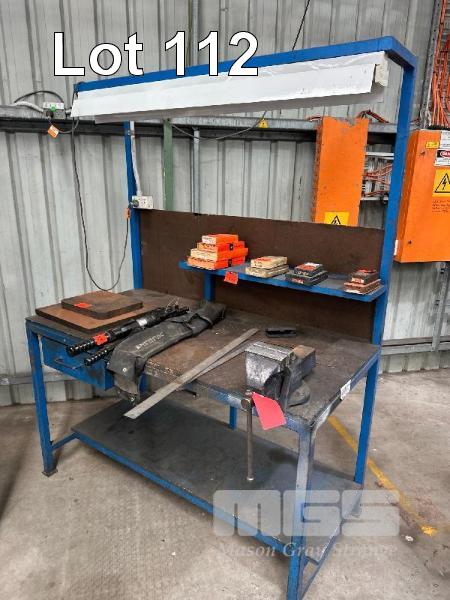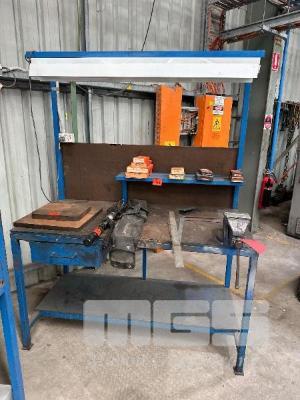 STEEL TUBE WORK BENCH, PARTICLEBOARD TOP, SHELF & LIGHT, 240V, 1580 x 800 x 940mm (H) WITH RECORD NO.5 VICE