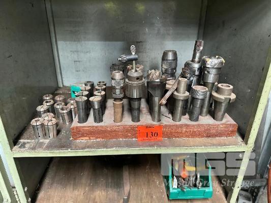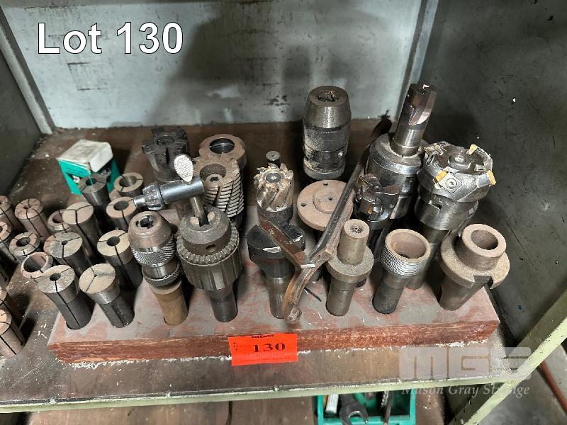 ASSORTED M/T MILL ATTACHEMENTS, DRILLS, FACING CUTTER, FLY CUTTER, 10mm KEYLESS CHUCK, 13mm KEY CHUCK, LARGE END MILL & SPARE COLLETS
