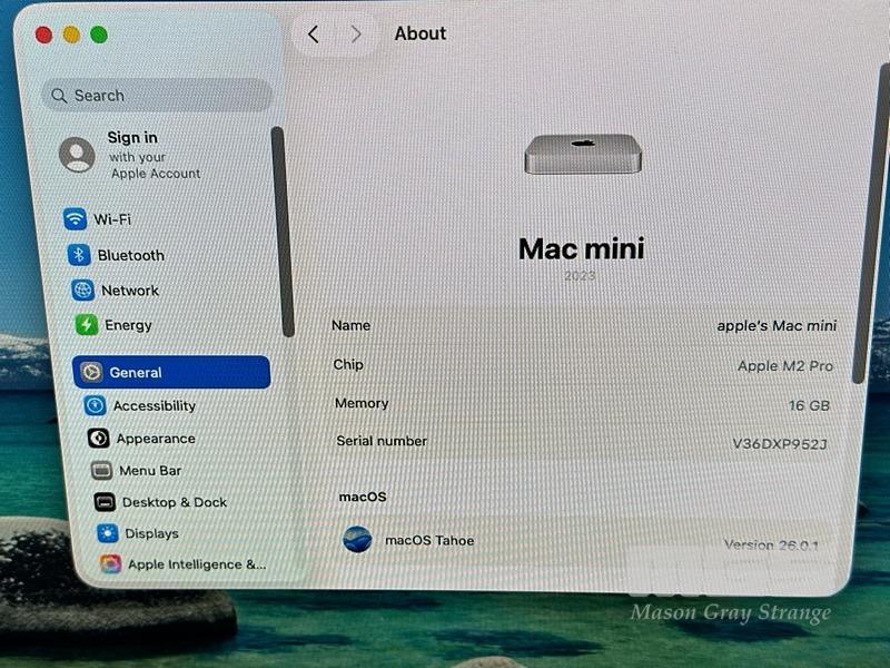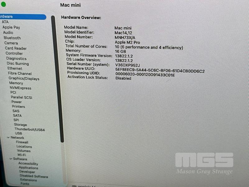 APPLE MAC MINI (A2816), MNH73X/A, APPLE M2 PRO 10 CPU, 16 GPU, 16GB RAM, 512GB SSD, Wi-Fi, BLUETOOTH, MAC OS 26 INSTALLED, KEYBOARD (A1644) & MOUSE (A1657) S/N:V36DXP952J