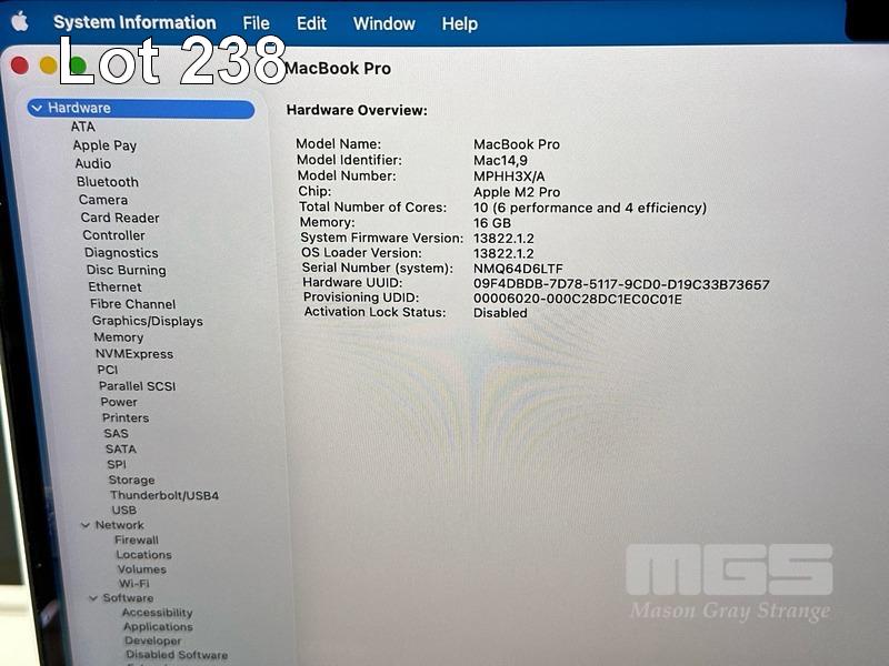 LAPTOP, APPLE MACBOOK PRO (A2779), MPHH3X/A, APPLE M2 PRO 10 CPU, 16 GPU, 16GB RAM, 512GB SSD, 14" RETINA DISPLAY (3024x1964), Wi-Fi, BLUETOOTH, MAC OS 26 INSTALLED & POWER SUPPLY (NOTE: MINOR MARKS ON SCREEN) S/N:NMQ64D6LTF