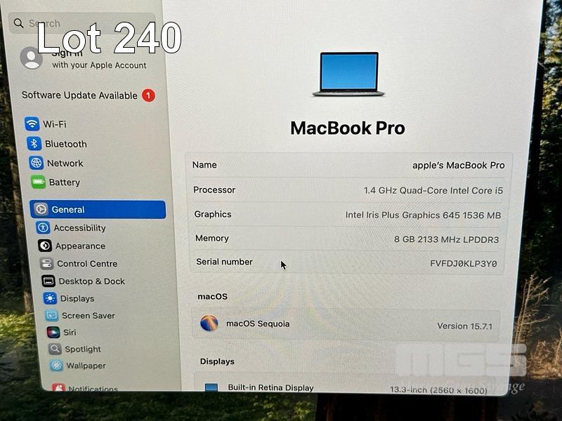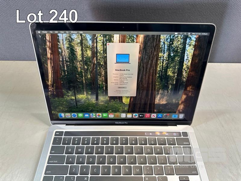 LAPTOP, APPLE MACBOOK PRO (A2289), CORE i5 8257U (8TH GEN) @ 1.4GHz, 8GB DDR3 RAM, 512GB SSD, 13.3" RETINA DISPLAY (2560x1600), INTEL IRIS PLUS GRAPHICS 645, Wi-Fi, BLUETOOTH, MAC OS 15 INSTALLED (NO USB-C POWER SUPPLY) (NOTE: SMALL SCRATCH ON SCREEN) S/N:FVFDJ0KLP3Y0