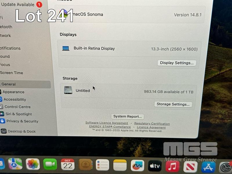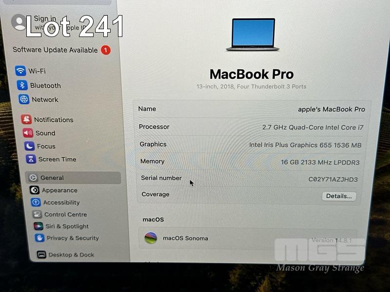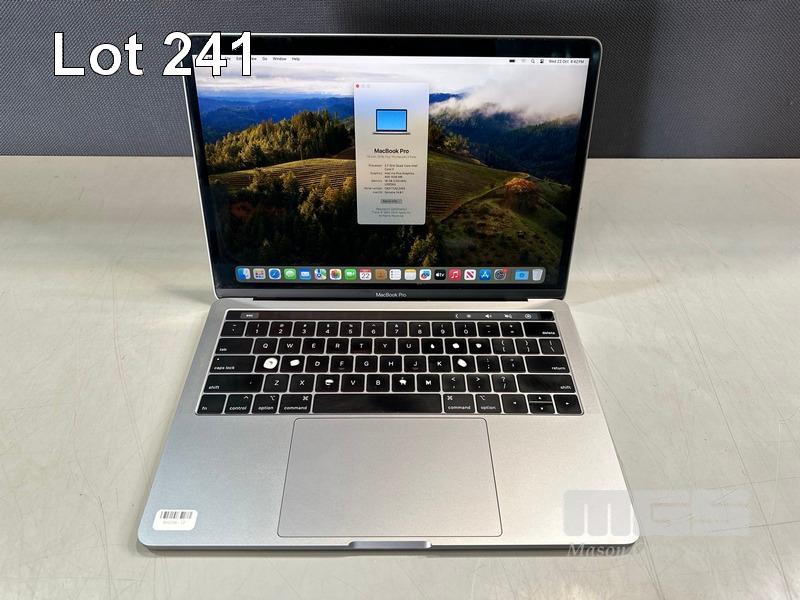 LAPTOP, APPLE MACBOOK PRO (A1989), CORE i7 8559U(8TH GEN) @ 2.7GHz, 16GB DDR3 RAM, 1TB SSD, 13.3" RETINA DISPLAY (2560x1600), INTEL IRIS PLUS GRAPHICS 655, Wi-Fi, BLUETOOTH, MAC OS 14 INSTALLED (NO USB-C POWER SUPPLY) (NOTE: SOME KEYS WORN ON KEYBOARD) S/N:C02Y71AZJHD3