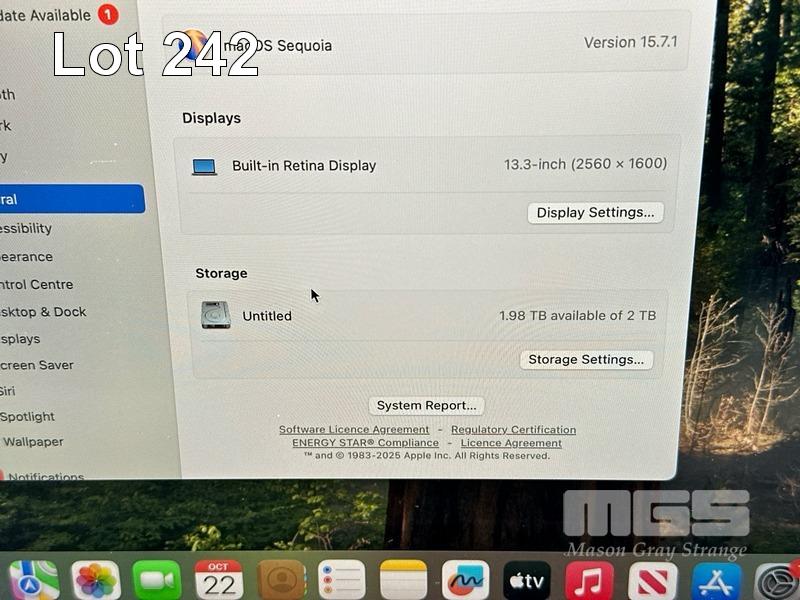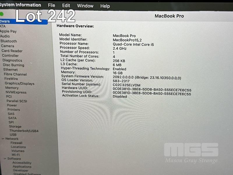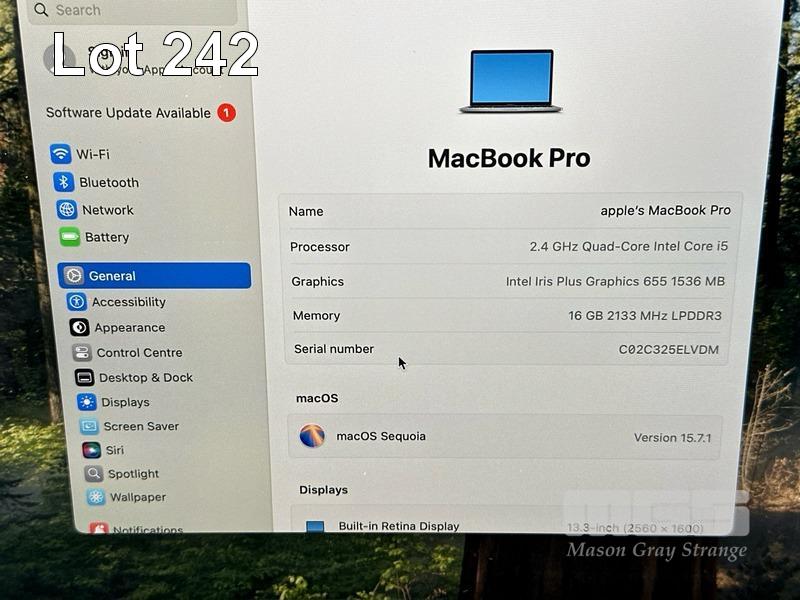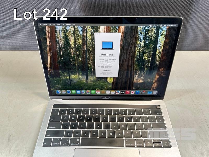 LAPTOP, APPLE MACBOOK PRO (A1989), CORE i5 8279U (8TH GEN) @ 2.4GHz, 16GB DDR3 RAM, 2TB SSD, 13.3" RETINA DISPLAY (2560x1600), INTEL IRIS PLUS GRAPHICS 655, Wi-Fi, BLUETOOTH, MAC OS 15 INSTALLED (NO USB-C POWER SUPPLY) (NOTE: SWOLLEN BATTERY, MINOR MARKS ON SCREEN) S/N:C02C325ELVDM