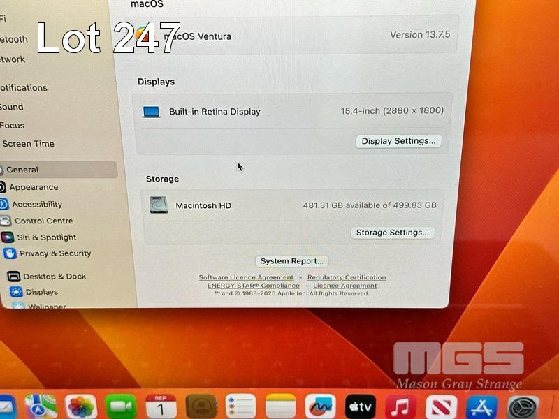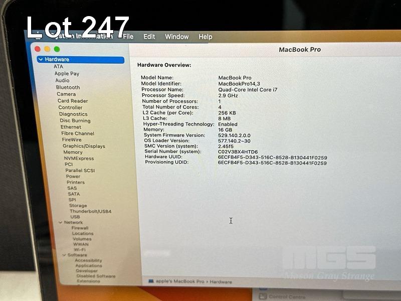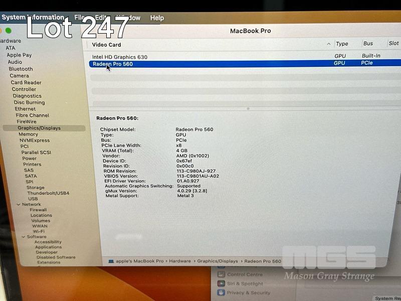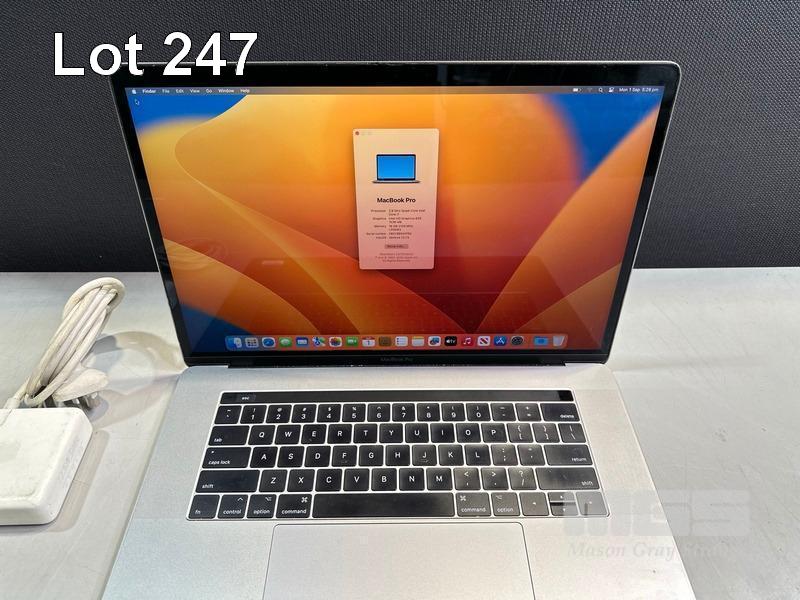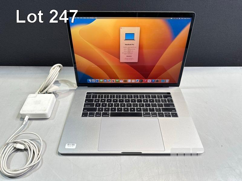 LAPTOP, APPLE MACBOOK PRO (A1707), CORE i7 7820HQ (7TH GEN) @ 2.9GHz, 16GB DDR3 RAM, 512GB SSD, 15.4" RETINA DISPLAY (2880x1800), INTEL HD GRAPHICS 630, 4GB RADEON PRO 560 VIDEO, Wi-Fi, BLUETOOTH, MAC OS 13 INSTALLED & USB-C POWER SUPPLY (NOTE: BATTERY SERVICE RECOMMENDED MESSAGE, ARROW KEYS STICKY, MARKS ON SCREEN) S/N:C02V3BX4HTD6