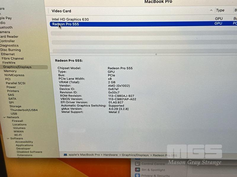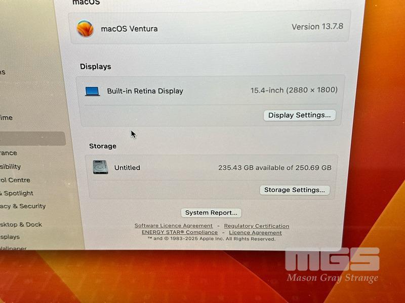 LAPTOP, APPLE MACBOOK PRO (A1707), CORE i7 7700HQ (7TH GEN) @ 2.8GHz, 16GB DDR3 RAM, 256GB SSD, 15.4" RETINA DISPLAY (2880x1800), INTEL HD GRAPHICS 630, 2GB RADEON PRO 555 VIDEO, Wi-Fi, BLUETOOTH, MAC OS 13 INSTALLED (NO USB-C POWER SUPPLY) (NOTE: 1 x KEY WORN ON KEYBOARD, MARKS ON SCREEN) S/N:C02VL1NQHTD5