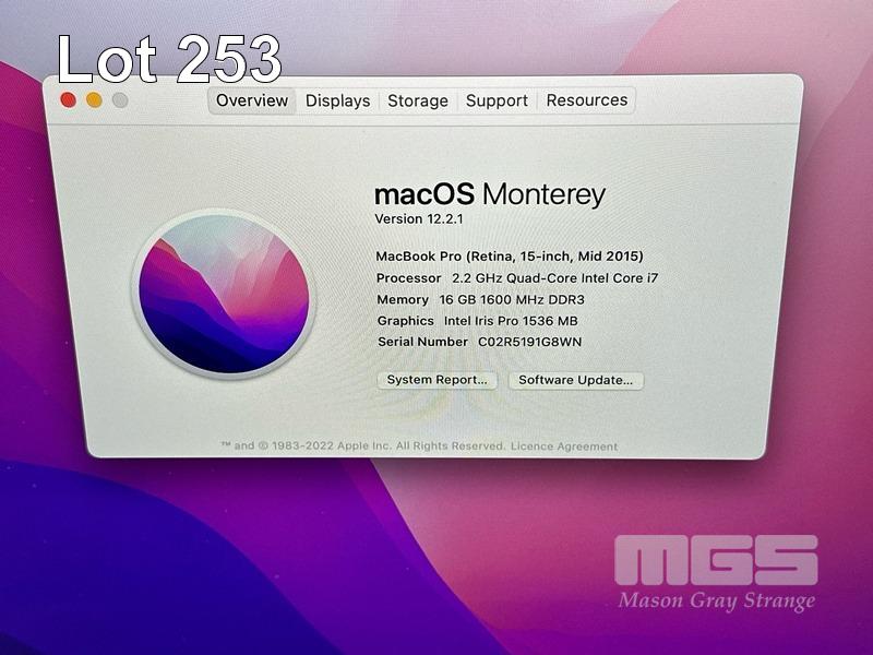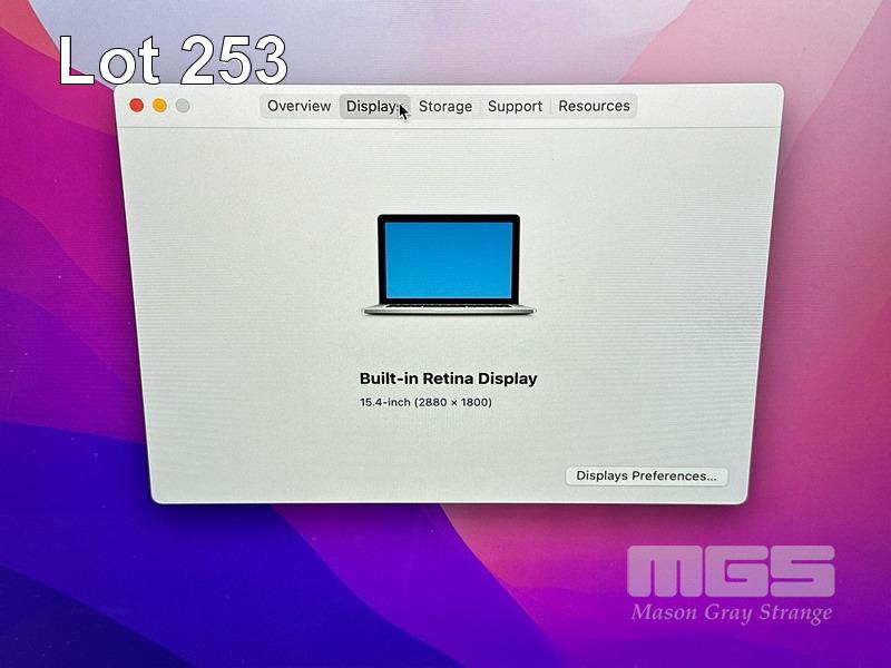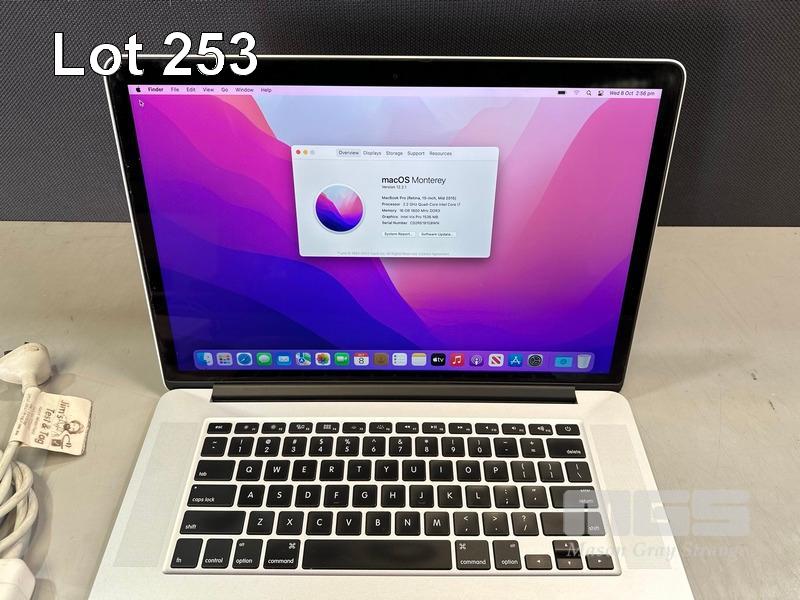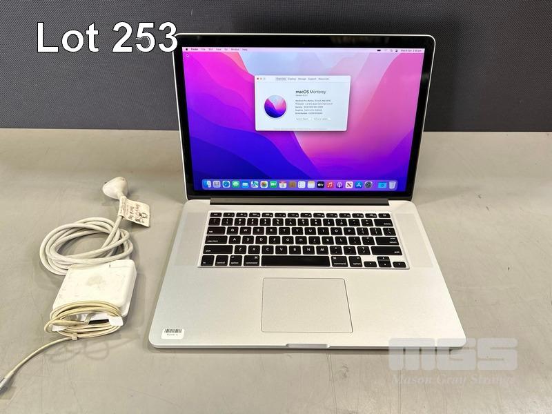 LAPTOP, APPLE MACBOOK PRO (A1398), CORE i7 4770HQ (4TH GEN) @ 2.2GHz, 16GB DDR3 RAM, 256GB SSD, 15.4" RETINA DISPLAY (2880x1800), INTEL IRIS PRO GRAPHICS, Wi-Fi, BLUETOOTH, MAC OS 12 INSTALLED & POWER SUPPLY (NOTE: BATTERY SERVICE RECOMMENDED MESSAGE, MINOR DENT IN CASING, MINOR MARKS ON SCREEN) S/N:C02R5191G8WN
