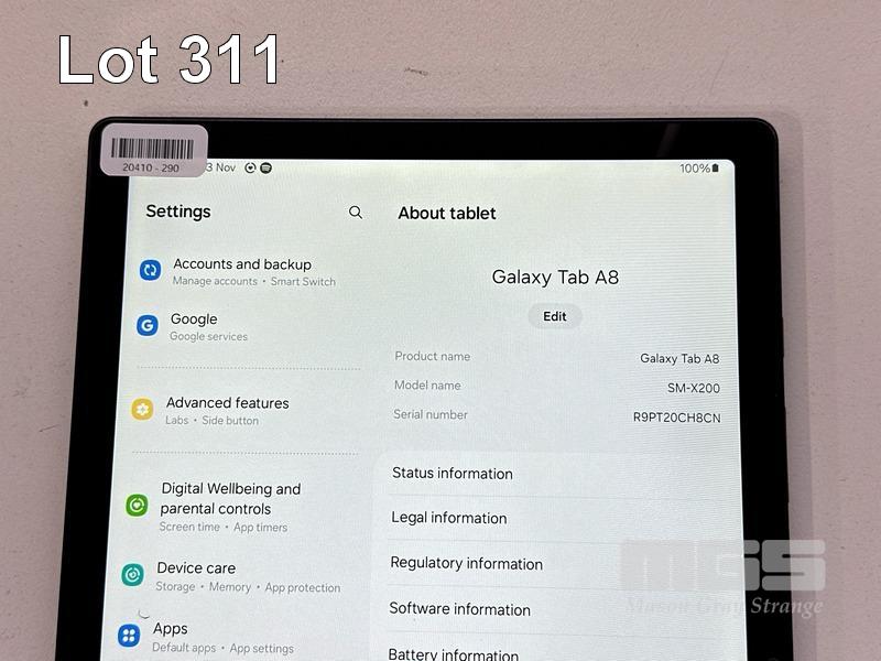 SAMSUNG GALAXY TAB A8 TABLET, SM-X200, 64GB (NO USB-C CABLE, NO CHARGER) (NOTE: SMALL SCRATCH ON SCREEN) S/N:R9PT20CH8CN