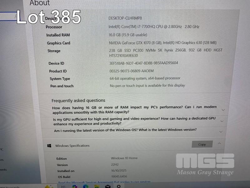 LAPTOP, ALIENWARE 15 R3, CORE i7 7700HQ (7TH GEN) @ 2.8GHz, 16GB DDR4 RAM, 256GB NVMe M.2 SSD, 1TB SATA HDD, 15.6" WIDESCREEN (1920x1080), 8GB NVIDIA GEFORCE GTX 1070 VIDEO, Wi-Fi, BLUETOOTH, WINDOWS 10 HOME INSTALLED & POWER SUPPLY S/N:382RBH2