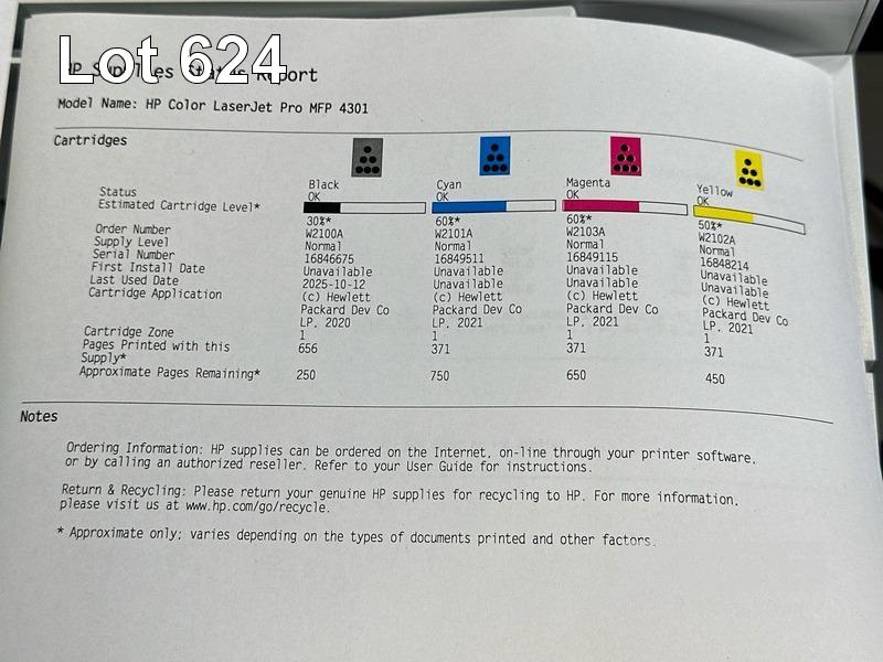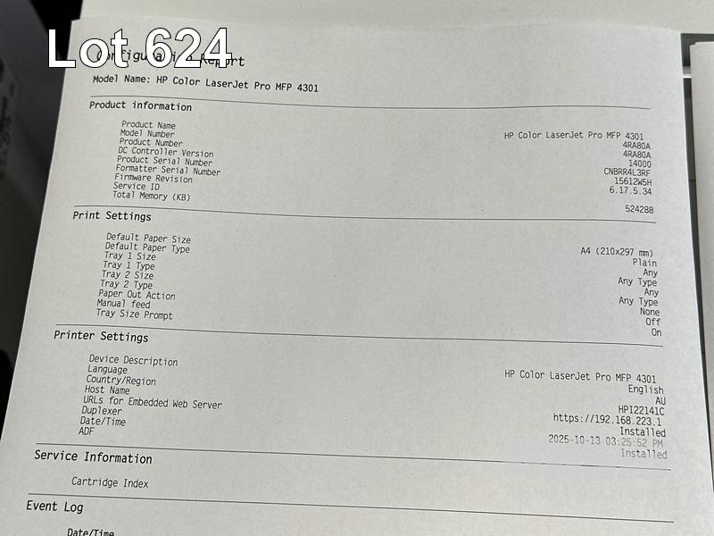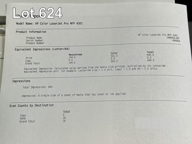 PRINTER, HP COLOUR LASERJET PRO MFP 4301dw, USB, NETWORK, 501 COLOUR & 144 B&W PAGES SHOWING (TEST PAGE ATTACHED) S/N:CNBRR4L3RF