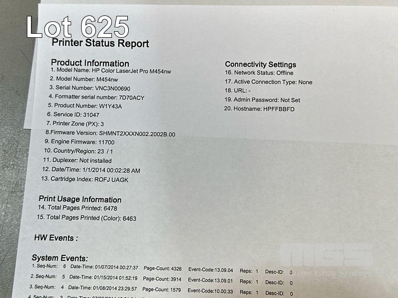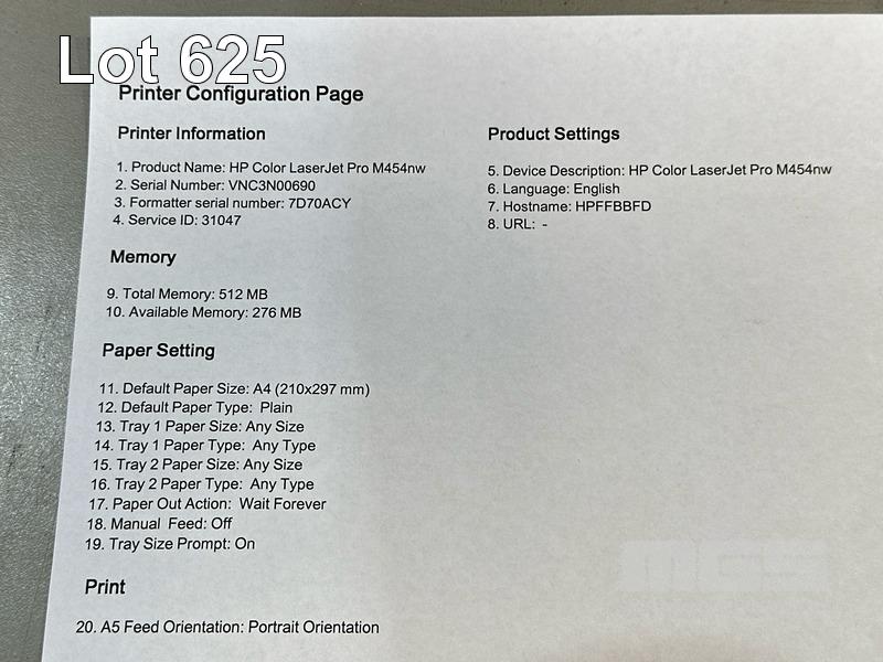PRINTER, HP COLOUR LASERJET PRO M454nw, USB, NETWORK, 6,463 COLOUR & 16 B&W PAGES (TEST PAGE ATTACHED) S/N:VNC3N00690
