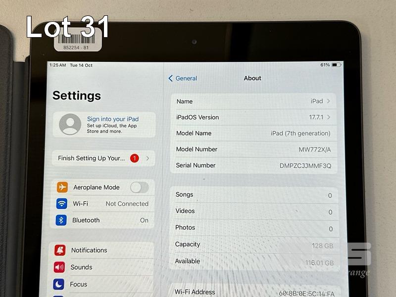 APPLE iPAD 7TH GEN, 128GB, Wi-Fi, SPACE GREY, MODEL MW772X/A, A2197 WITH KEYBOARD COVER (NO CABLE, NO CHARGER) (NOTE: MINOR SCRATCHES ON SCREEN) S/N:DMPZCJJMMF3Q