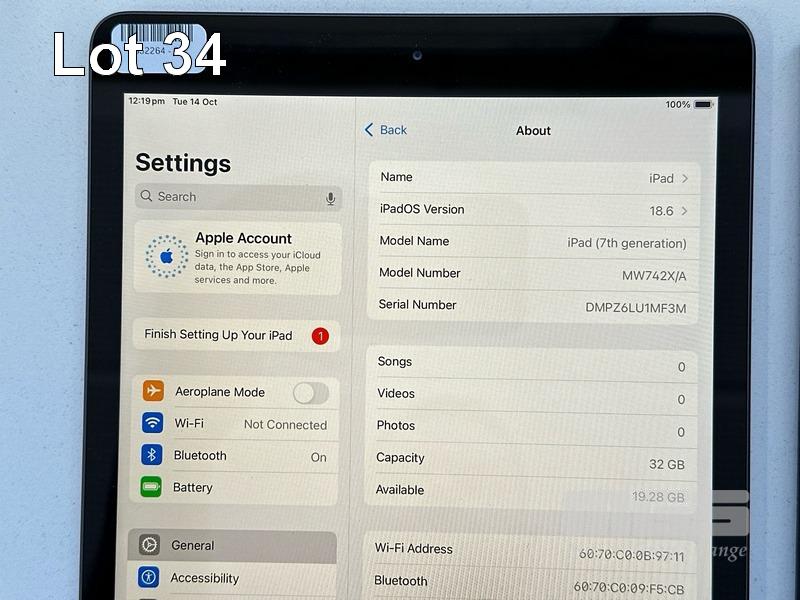 APPLE iPAD 7TH GEN, 32GB, Wi-Fi, SPACE GREY, MODEL MW742X/A, A2197 WITH COVER (NO CABLE, NO CHARGER) S/N:DMPZ6LU1MF3M