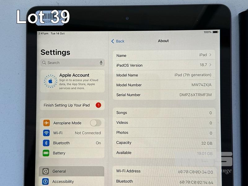 APPLE iPAD 7TH GEN, 32GB, Wi-Fi, SPACE GREY, MODEL MW742X/A, A2197 WITH COVER (NO CABLE, NO CHARGER) S/N:DMPZ6XTRMF3M